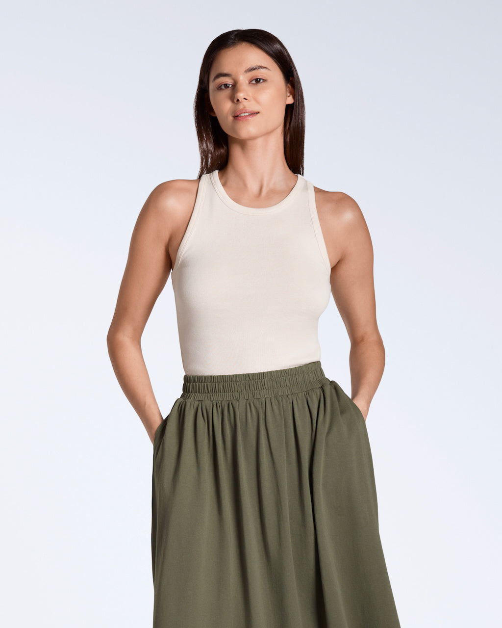 A simple yet timeless design, this midi skirt in sizes XS-L is made from 100% organic cotton at a breathable 200 GSM. With 2 hidden pockets for improved functionality, and an expandable waistband made from biodegradable organic natural rubber elastic for extra comfort, this skirt in olive and navy colours is a versatile wardrobe addition. The gathered design at the waist gives movement and effortless elegance to any outfit.